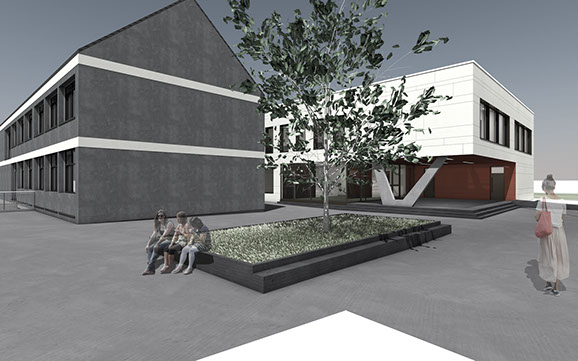 In einem zweiten Bauabschnitt werden im Frühjahr 2020 zwei vorhanden Gebäude im Schulzentrum durch einen Verbindungsgebäude zusammengefügt.